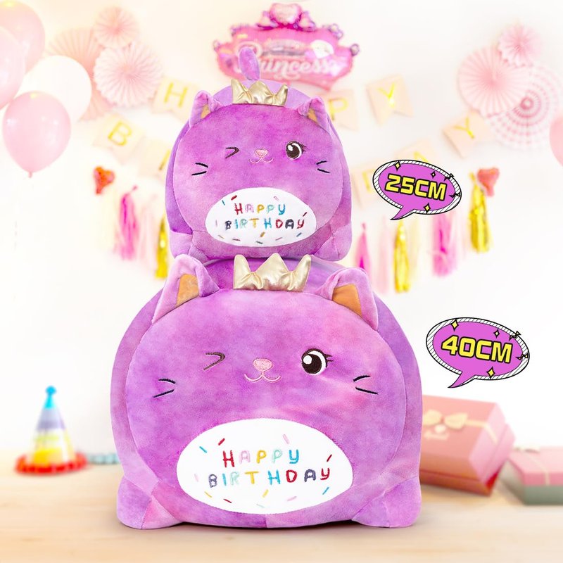 MIAOHAHA Happy Birthday Plush Pillow Toy,Soft Plush Cat Toy Plushies Gift for Kids and Girls(Purple Cat,25cm/9.8in)