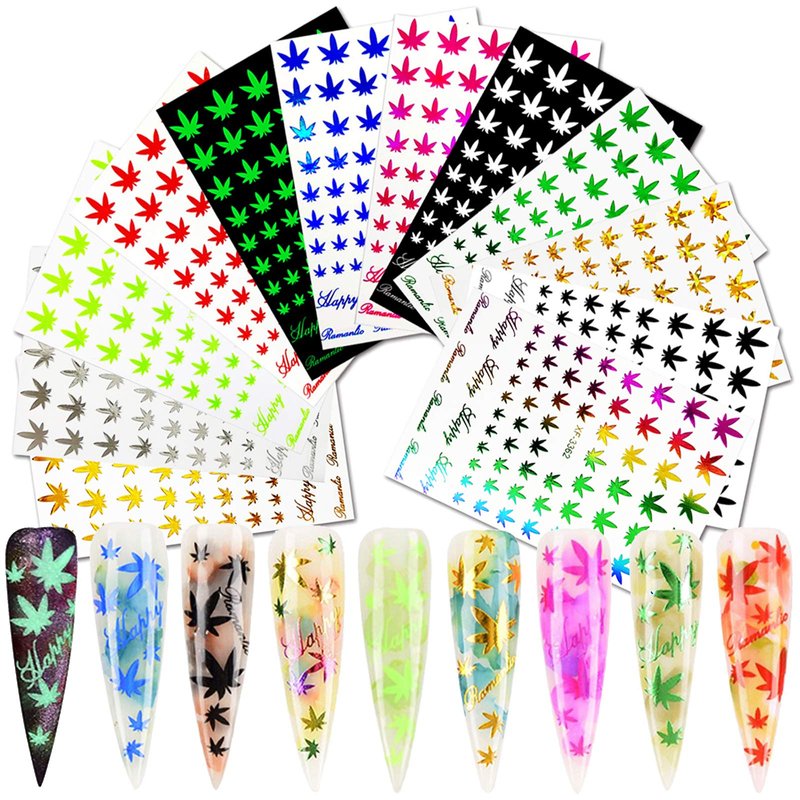 - 🍁【Package】You will get 12 sheets of pot leaves nail stickers in 12 colors, enough quantity for meeting your different nail decoration needs and you can also share them with your friends and family members. Two of them are transparent card for luminous and white leaves. It might overlap with other cards. Pls kindly check the quantity carefully💖💖