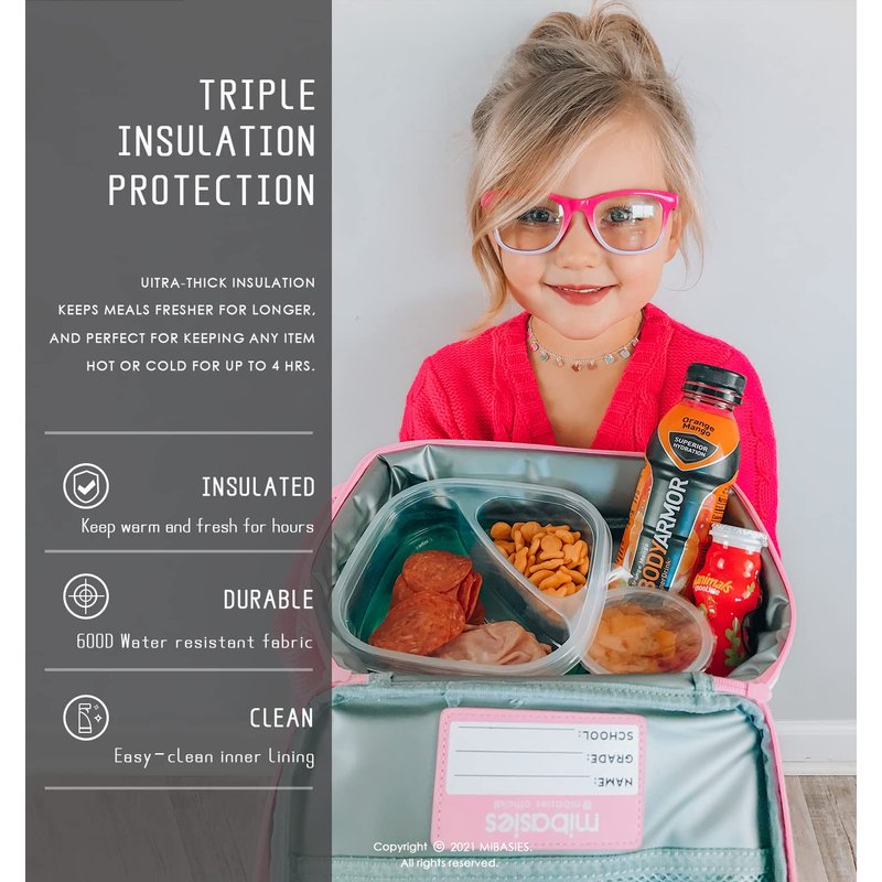 - 【Practical Design for Kids】Double Zipper with Long Puller makes it easy to open even for a toddler. The lunch box for girls features a handle on top with a Snap Buckle to carry by hand or clip to a backpack for a saving room, it also comes with an adjustable and detachable shoulder strap for making it hand-free, that’s so convenient for going out. We also design the small Name Tag for writing your kids' names on, so she could identify her girls' lunch boxes easily.