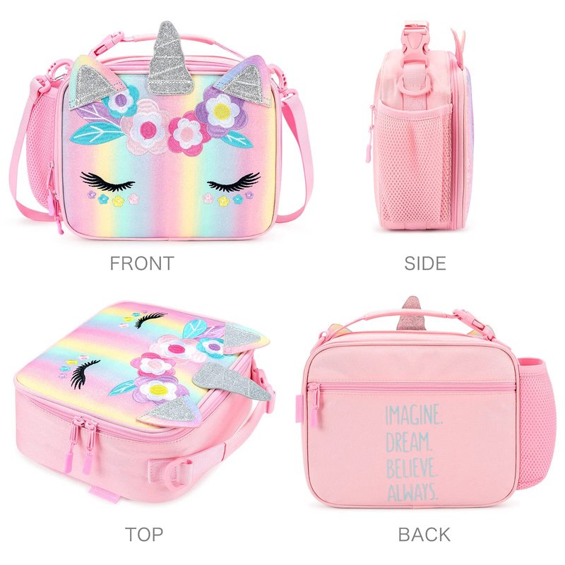 - 【Perfect Gift for Little Girls】This unicorn lunch box for girls comes with a lovely horn and ears, it's a hit and trendy element among little girls. Colorful embroidered flowers and cute eyelashes also add charm, that's so cute and easy for matching to wear with different kinds of backpacks and brings so much fun to your little princess at lunchtime. Perfect gift for your daughter, granddaughter, niece, etc. Your little one will be obsessed with this fashion and practical school partner.