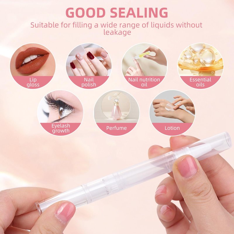 - Convenient Design:empty cuticle oil pens Each pen holds up to 5ml of liquid, allowing for easy and controlled application with the soft brush tip.Transparent body for easy monitoring of liquid levels, with a twist-up mechanism that ensures precise application.