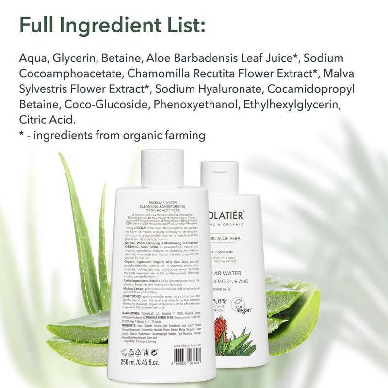 - Micellar water with organic aloe vera juice removes makeup, dirt, and oil while hydrating and softening the skin. This micellar water makeup remover is suitable for all skin types and perfect for use as a gentle face cleanser for women.