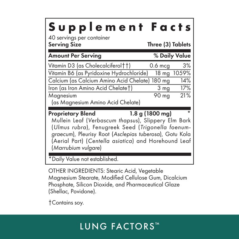 - HERBAL BLEND - Lung Factors contains a number of herbs traditionally known for lung and respiratory support. They include Mullein Leaf, Slippery Elm, Fenugreek Seed, Pleurisy Root, Gotu Kola, and Horehound Leaf.