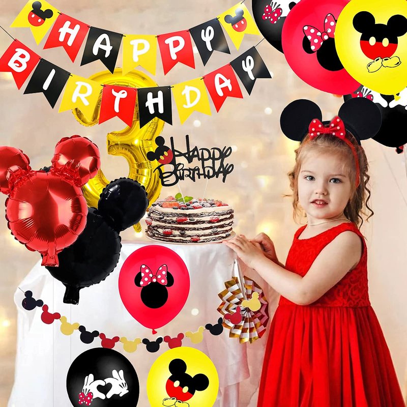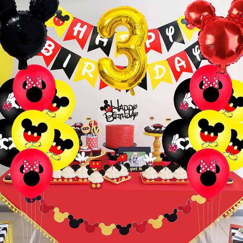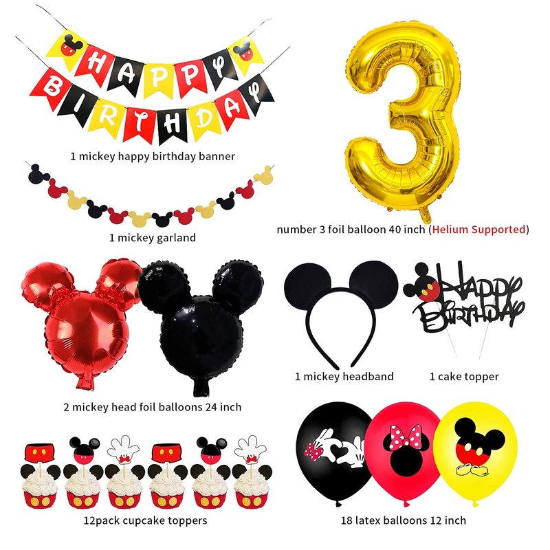 • Mickey Third Party Supplies: Perfect birthday party must be includes 1 happy birthday banner, 1 garland, 1 cake topper, 12 cupcake toppers, 18 latex balloons 12 inch(3 different patterns), gold number 3 foil balloon 40 inch, 2 mickey head foil balloons 24 inch, 1 mickey headband.