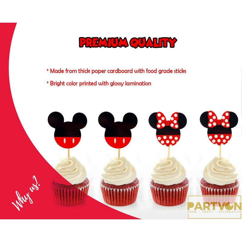 - Easy to Use: Micky Minnie birthday cup toppers are pre-assembled, no DIY required. just placing them on cupcakes, fruit pieces, appetizers and so on, not only make food look more delicious, but also a good photo prop, and you will certainly receive a lot of compliments.