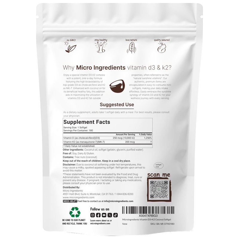 Micro Ingredients Vitamin D3 10,000 IU + K2 MK-7 200 mcg, 180 Softgels | Virgin Coconut Oil | 2-in-1 Bone, Immune & Heart Support | Easy to Swallow, Non-GMO