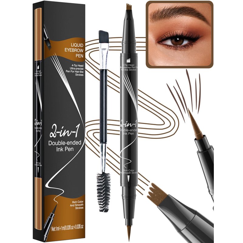 Microblading Eyebrow Pen & Eyeliner - Eyebrow Pencil Magical 2-in-1 Waterproof Eye Brow Pencils for Women with 4-Fork-Tip and Liquid Eyeliner, Create Natural Hair-Like Brows (Light Brown)