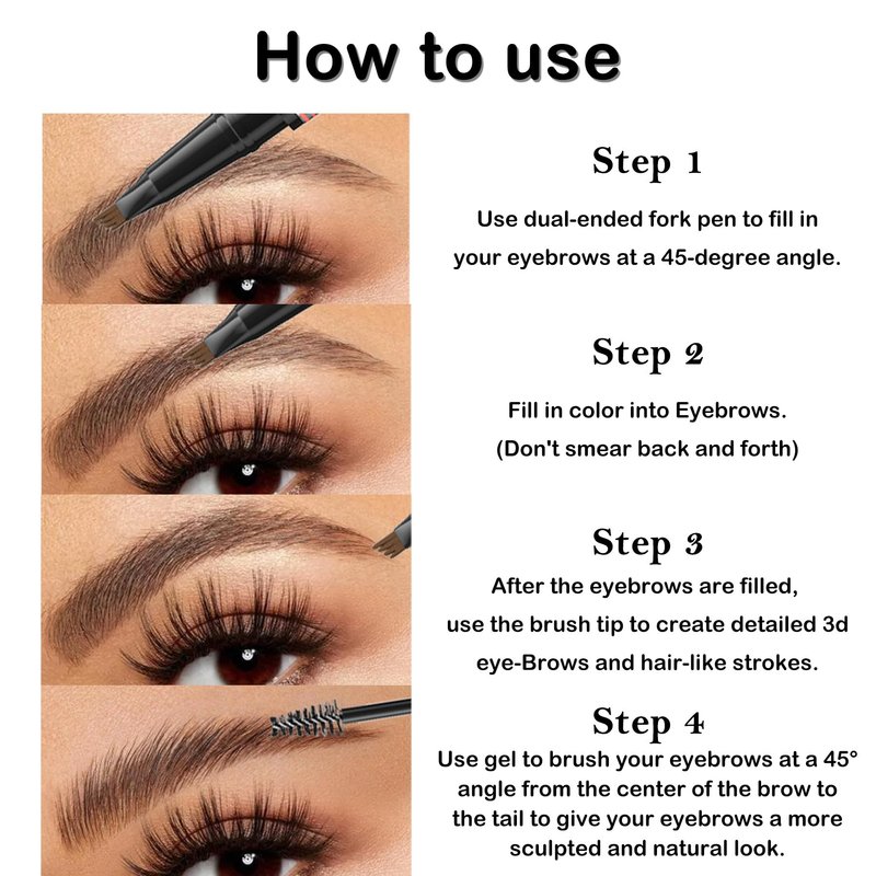 - Easy to use: Before application, pls shake the brow pen up and down several times. When you use dual-ended fork pen to fill in your eyebrows, pls keep the pen at a 45-degree angle then fill in color into your eyebrows. After the eyebrows are filled, pls use the clear brow gel to brush your eyebrows at a 45degree angle from the center of the brow to the tail to give your brows a more sculpted and natural look. When not in use, pls keep the lid tightly to prevent the liquid from evaporating & drying, ensure you hear a 'click' when closing it!