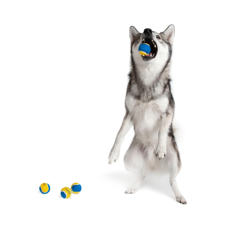 - Includes 1 set of 4 blue and yellow 1.5" in diameter dog tennis balls.