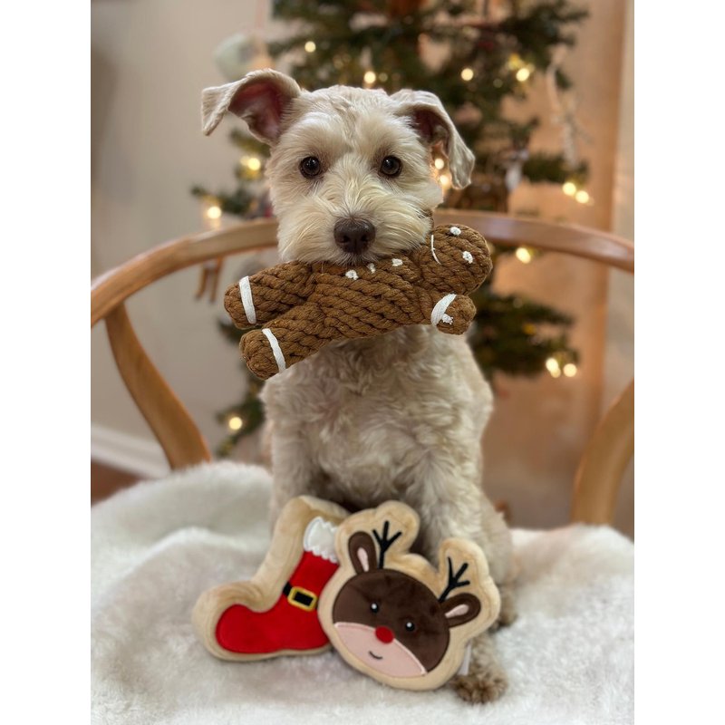 Designed to resemble your favorite Frosted Sugar Cookies! This Reindeer Sugar Cookie is frosted to look like a reindeer! While you and your family enjoy Christmas dinner and dessert, gift your pet their own treat! Perfect gift for inside a stocking or to open on Christmas morning with the rest of the family! Deliciously cute, this reindeer sugar cookie is made of high-quality materials, stuffed with polyfil and a squeaker! Embroidered detailing outlines the smiley reindeer's face featured on the cookie toy! Small measures 5.5" x 5.5" x 1." If your dog loves plush toys, we know they will be super excited to receive this on Christmas!