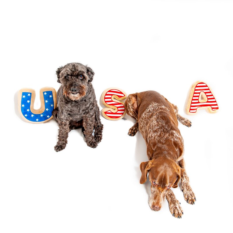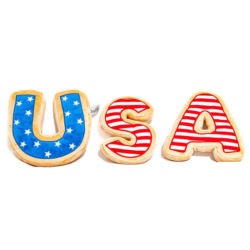 Each patriotic sugar cookie letter measures 5" x 5". Celebrate the 4th of July, Memorial Day, Labor Day, or just your USA pride with these adorable sugar cookie plush toys! Each toy includes a squeaker for added enjoyment. These toys are designed to resemble your favorite decorated sugar cookies and are dog friendly, in a form they will love! If your dog loves plush toys, these are the ones for them!