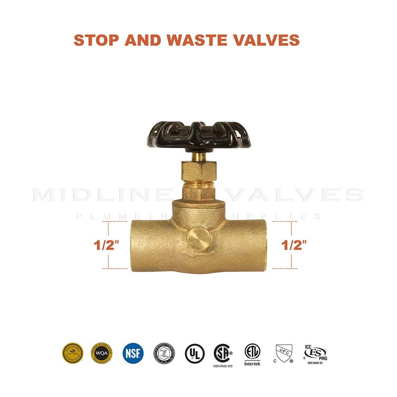 Midline Valve 632D234 Stop Valve with Drain, Lead-Free 1/2 in. Sweat Connections, Brass