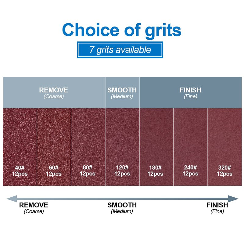 - 【7 DIFFERENT GRIDS】Sanding pads for woodworking contain 12 pcs of each grit: 40/ 60/ 80/ 120/ 180/ 240/ 320 gritss, total 84 pieces. The grit number is printed on the back of the mouse sanding sheets for easy identification.