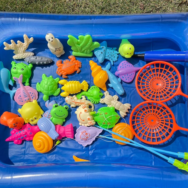 - Contain 1 Fishing Pool, 2 fishing rods, 2 fishing nets, 1 cylinder and 30 kinds of toy fishes animals . Best for ocean animal learning party!