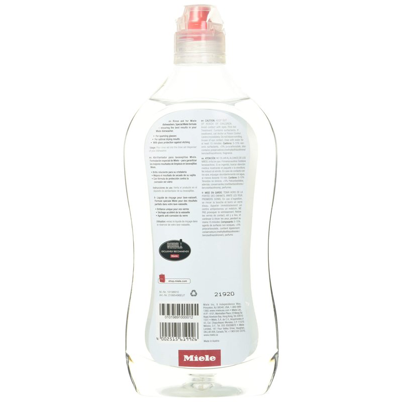 - Items delivered: 1 x Miele Dishwasher Rinse Aid with easy-pour bottle with dosing cap made from 100% recycled plastic, 17 oz