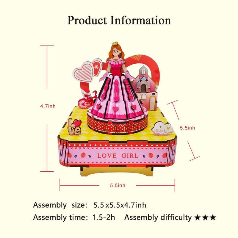 - Wooden music box is composed of 3D puzzle, after the assembly is completed, turn the mechanical spring at the bottom, the girl will rotate with the music.