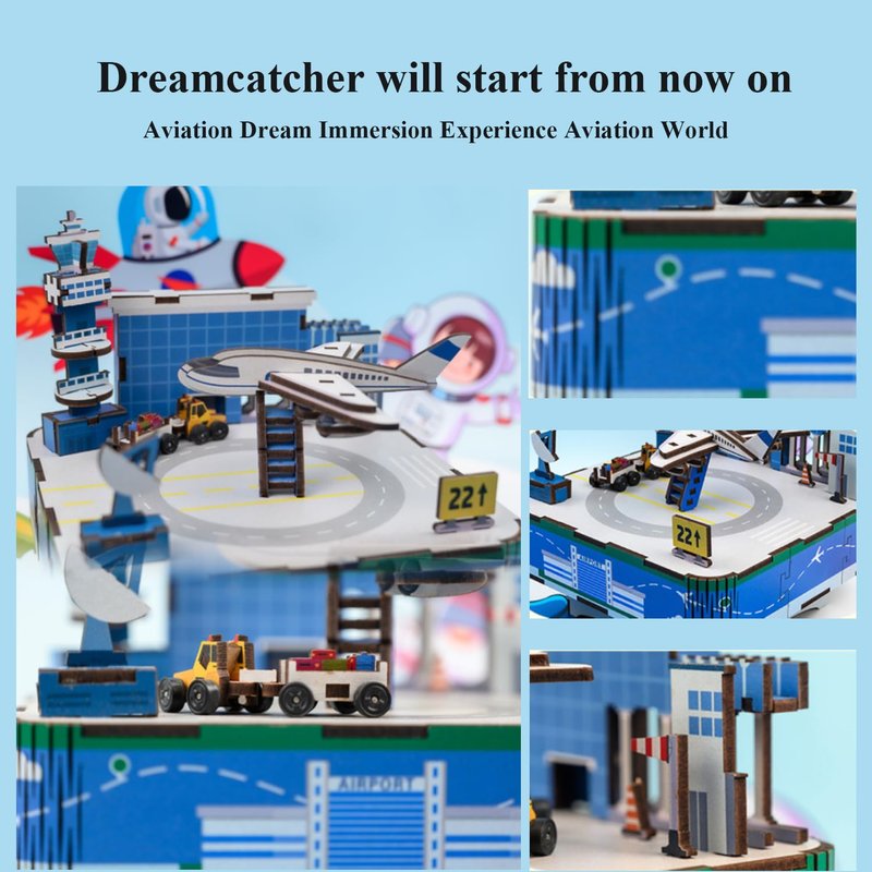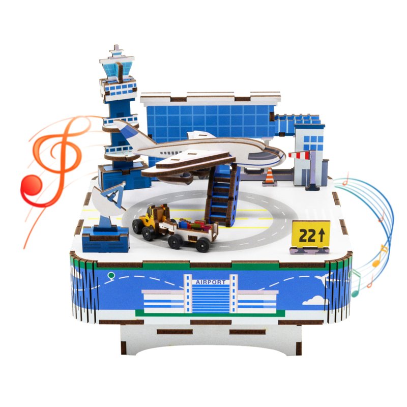 - 3D wooden music box, aviation model kit, gifts for kids. Once assembled, a mechanical spring at the bottom is turned, and the trailer begins to circle the plane to the music.