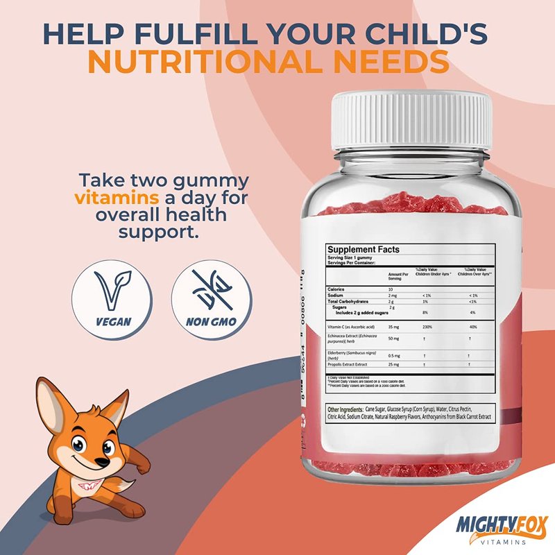 MIGHTY FOX VITAMINS Elderberry Gummies for Kids with Sambucus, Echinacea, Propolis and Vitamin C - 100% Vegan, Gluten Free, Non GMO, Raspberry Flavor - 100 Count (100 Count)
