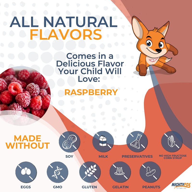 - Kids love our Mighty Fox Elderberry Gummies, Raspberry flavored, all natural with no Gelatin, no Gluten, no Soy, no GMOs and no artificial colors or additives