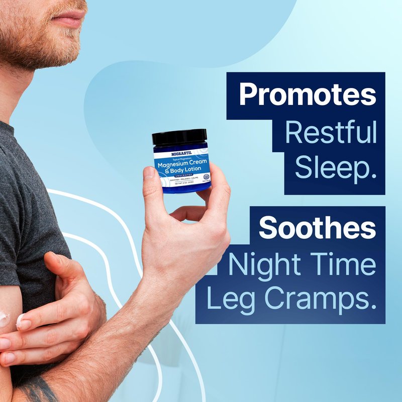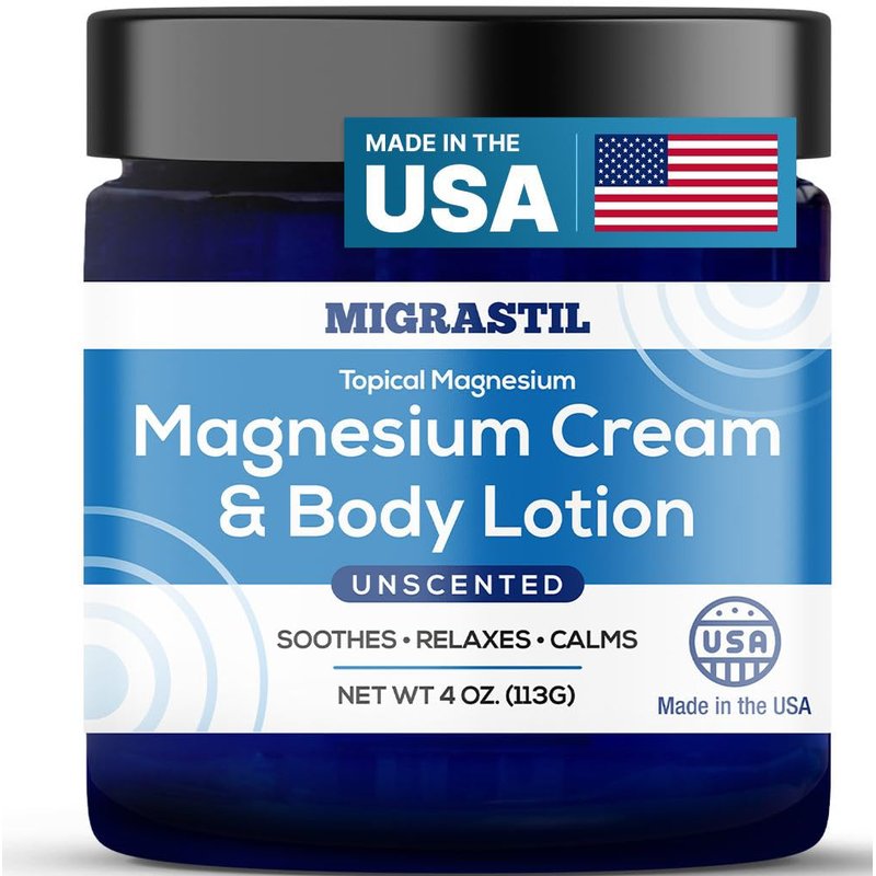 MIGRASTIL Topical Magnesium Cream & Body Lotion 4oz. - Promotes Sleep and Soothing Relief for Sore Muscles, Leg Cramps, Etc. Made in The USA.