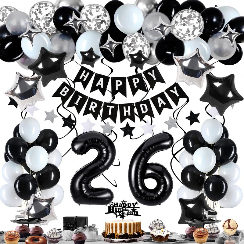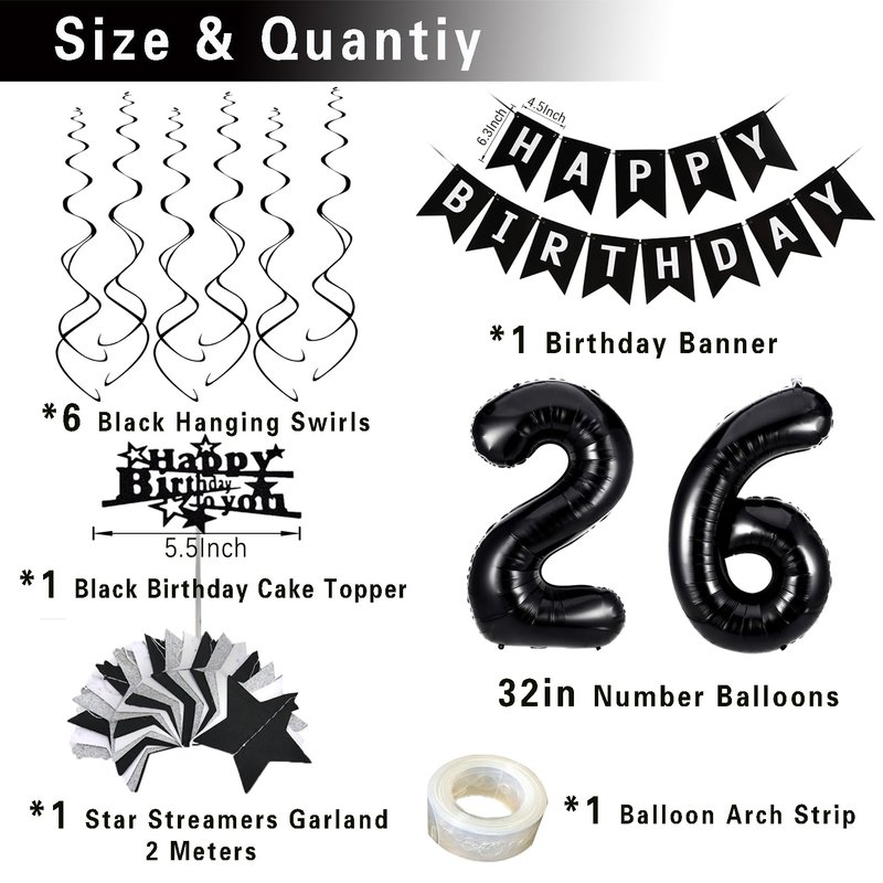 - 【26 Birthday Decoration Kit Includes】Black and white birthdaybanner *1; 10"Black White Silver latex balloons *30; Silver confetti balloons *6; 18"aluminum star balloons *6; 10"black star balloons *3; 10" silver four-pointed star *6; Black birthday cake topper *1; Black birthday foil number balloons 26; Black hanging swirls *6, Black, white silver star streamers garland *1,. Balloon arch strip *1.