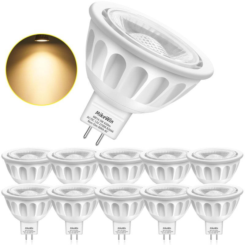 MikeWin MR16 LED Bulb 10Pack,5W 12V, GU5.3 Bi-Pin Base,50-Watt Equivalent,2700K Warm White,Non-Dimmable MR16 LED Spot Light Bulbs for Indoor Outdoor Landscape Track Lighting