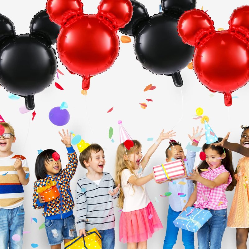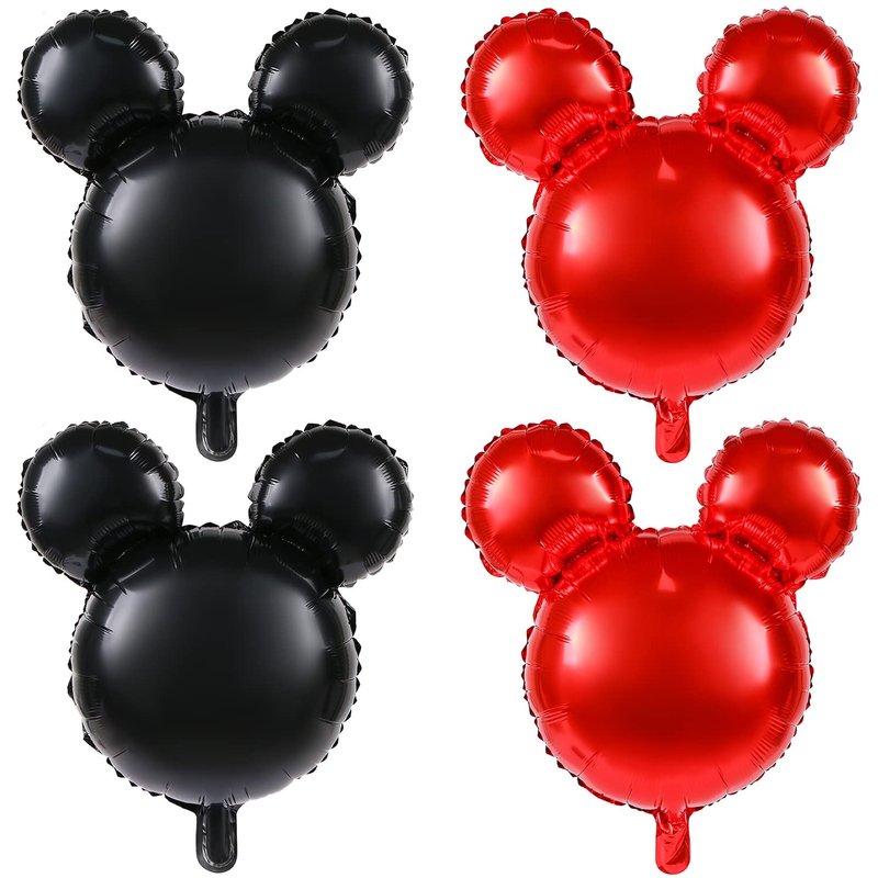 MIKIMIQI 4 Pcs Mouse Head Foil Balloons, 24'' Mouse Mylar Balloon for Birthday Party Decorations Jumbo Mouse Head Aluminum Foil Balloons Party Favors Supplies (Black Red)