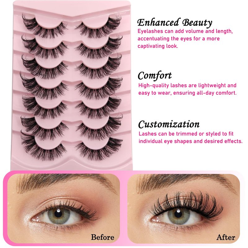 Enhanced Beauty: Eyelashes can add volume and length, accentuating the eyes for a more captivating look. Comfort: High-quality lashes are lightweight and easy to wear, ensuring all-day comfort. Reusability: False lashes are designed for multiple uses, offering cost-effectiveness. Easy Application: With practice, they can be applied quickly, making them suitable for any makeup routine. Customization: They can be trimmed or styled to fit individual eye shapes and desired effects.