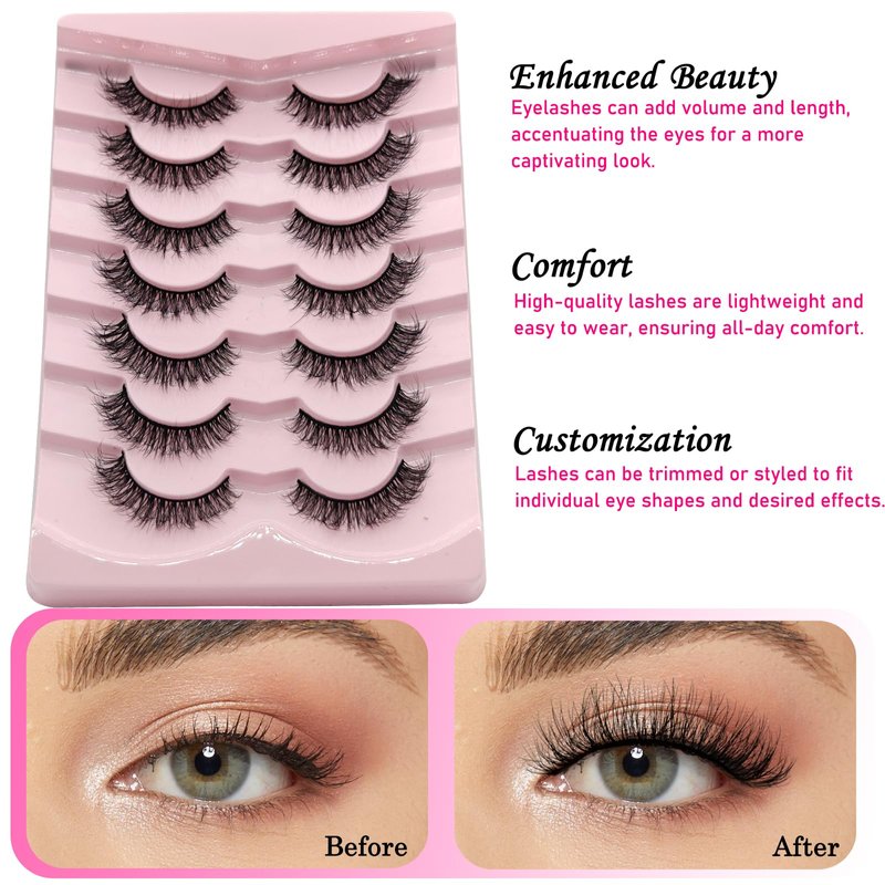 Enhanced Beauty: Eyelashes can add volume and length, accentuating the eyes for a more captivating look. Comfort: High-quality lashes are lightweight and easy to wear, ensuring all-day comfort. Reusability: False lashes are designed for multiple uses, offering cost-effectiveness. Easy Application: With practice, they can be applied quickly, making them suitable for any makeup routine. Customization: They can be trimmed or styled to fit individual eye shapes and desired effects.