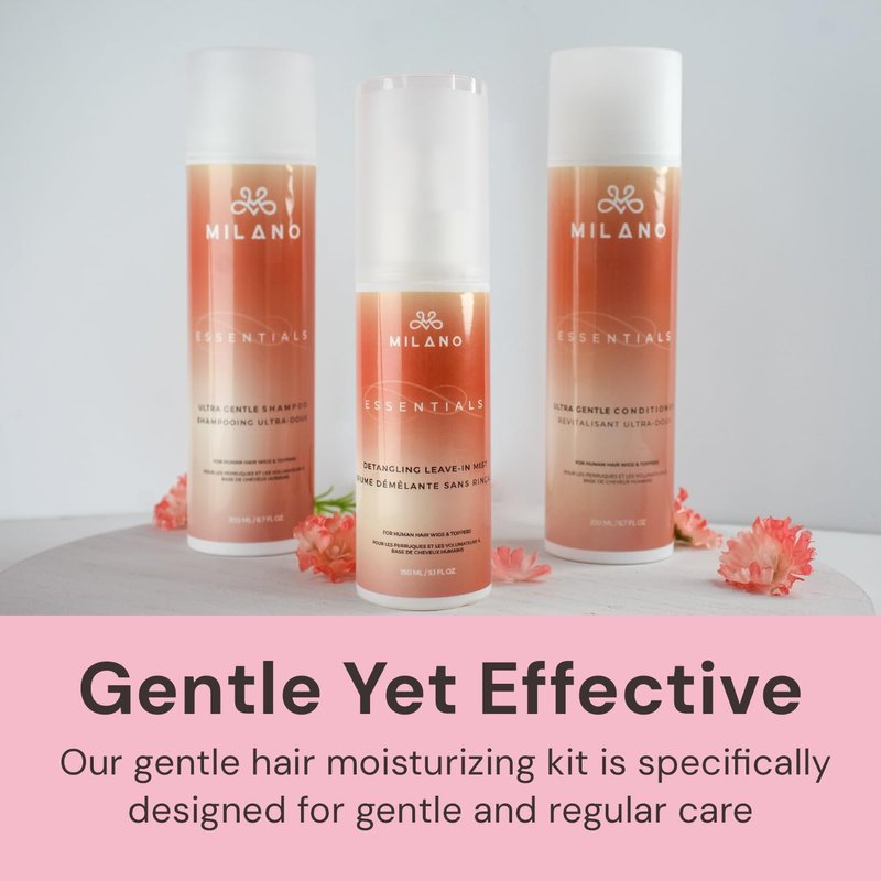 Milano Collection Essentials Gentle Bundle, Regular Care Kit for Natural Hair & Human Hair Wigs & Toppers, Ultra Gentle Hair Shampoo, Conditioner & Leave-In Detangler Mist for Women, 3 Pack