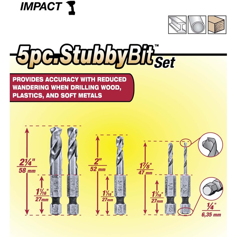 Milescraft 2320 5pc Stubby Bit Set- 5pc. HSS Stubby Drill Bits with 1/4-Inch Quick Change Hex Shank (3/32in, 1/8in, 3/16in, 1/4in, 5/16in) - Drill Bit Holder Included