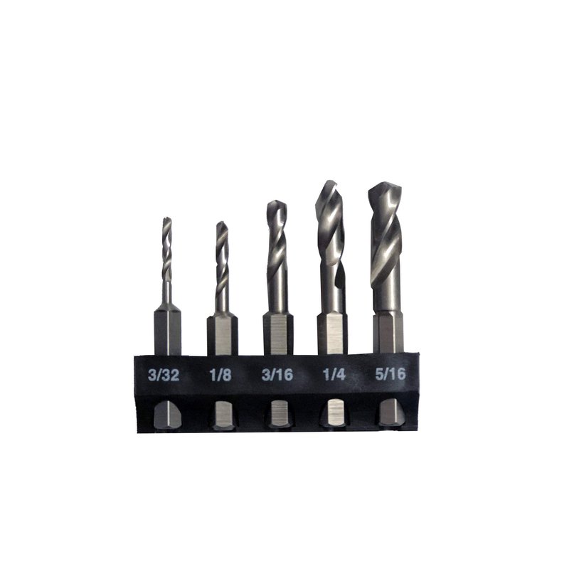- 5 piece set of common size drill bits (3/32in, 1/8in, 3/16in, 1/4in, 5/16in)