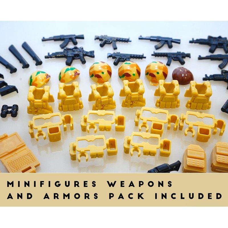 - Army Base setting with different sets of Army armors, headpieces and lots of weapons enough to equip 6 soldiers minifigures guys. Minifigs are not included.