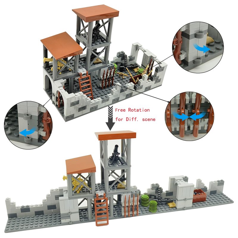 【DIY Military Base】This military base can be transformed into various war scenarios, such as closed or open bases, and can be used for various war simulations. This military toy set includes modern guns, sandbags, and wire mesh, as well as other military items that children can use to simulate commanding battles.