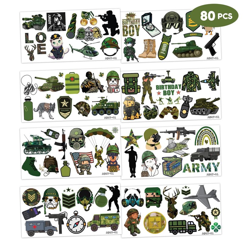 - 🎖️【PERFECT TATTOOS FOR THEMED ARMY】: Army temporary tattoos from our popular collection will meet children's expectations, as they eagerly anticipate having them at Birthday parties and special celebrations. Each set includes 8 sheets with a total of 80 Pcs. The size of each tattoo sticker is 6.1 * 3.1 inches, suitable for both adults and kids. The assortment of army-themed tattoos, designed in various styles, promises to enhance the lively atmosphere for parties.