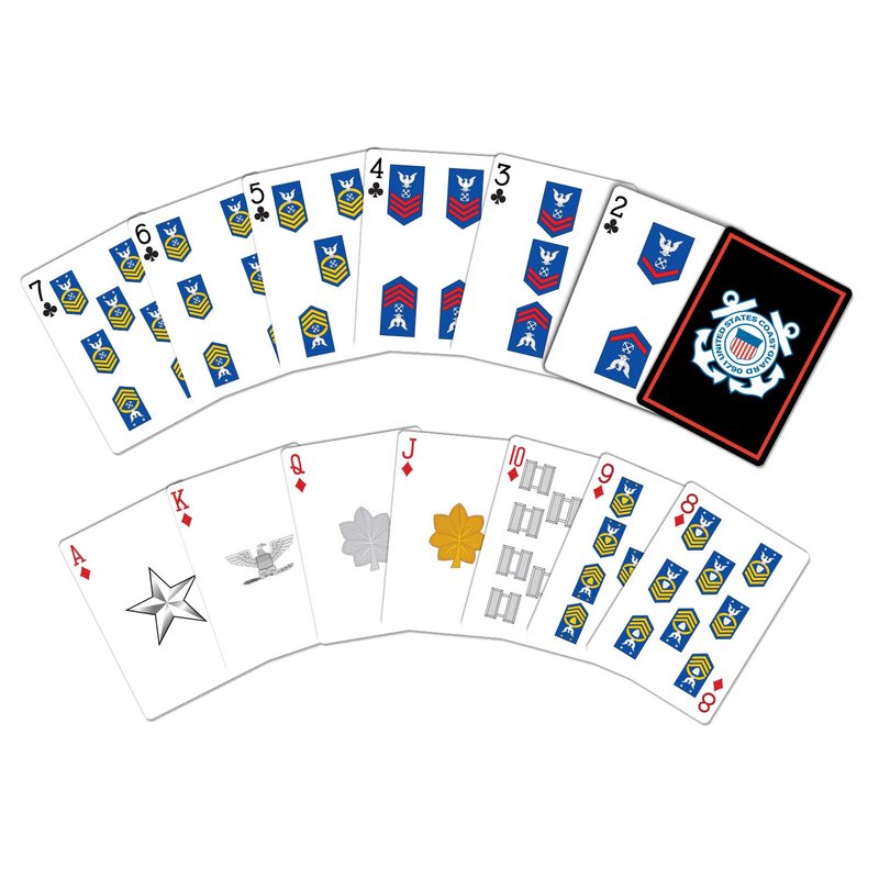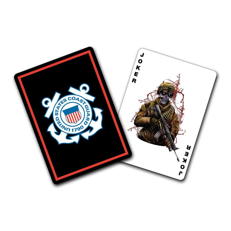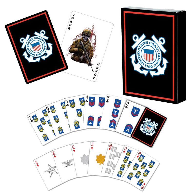 - AUTHENTICALLY DESIGNED: Card backs proudly display the official Coast Guard logo and the front has Coast Guard rank insignia. The deck is further enhanced with a striking skull joker card and a premium tuck box bearing the USCG emblem.