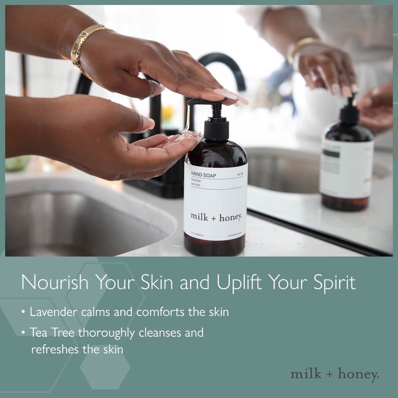- NOURISH AND REFRESH YOUR SKIN - Our milk and honey hand soap has the perfect combination of organic Lavender oil and organic Tea Tree oil that calms, comforts, and thoroughly cleanses your skin. Have clean soft hands after every wash with our gentle yet effective moisturizing hand soap.