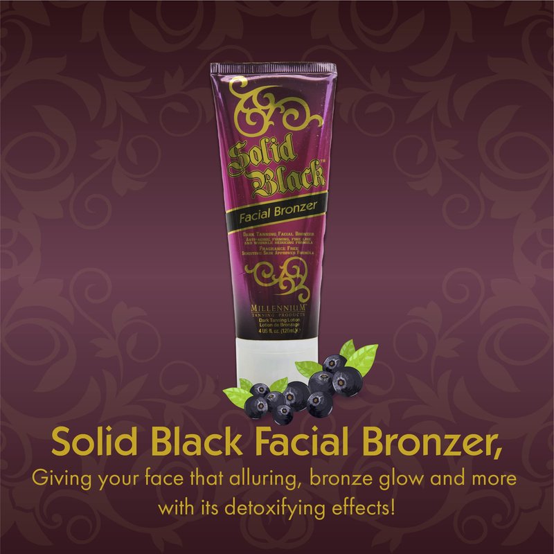 From Millennium Tanning Solid Black is another tanning lotion that will astonish--- the Solid Black Facial Bronzer! Made specifically for your facial tanning needs, it goes above and beyond any regular tanner. Here’s a face tanning lotion for tanning beds that won’t just let your skin look young and radiant. It’s comprised of properties that may shield against damage, stresses, and toxins that cause fine lines and wrinkles. Its skin tightening agents aid in bringing back that enviable skin bounce and radiance! Our indoor tanning lotion is infused with Black Tea and Acai Berry extracts to fortify the skin’s prowess in detoxification. Your skin is subjected to daily stresses and toxins. And what better way to combat these skin-aging foes than to start from beneath the dermis! As you add this tanning bed face lotion to your skincare must-dos, toxins will be flushed out. Leaving your face clean and fresh. Fewer impurities mean a reduced likelihood of incurring blemishes and dark spots. The cherry on top of it all? It’s still an amazing tanner that offers a deep pigment, with a bronze gleam!