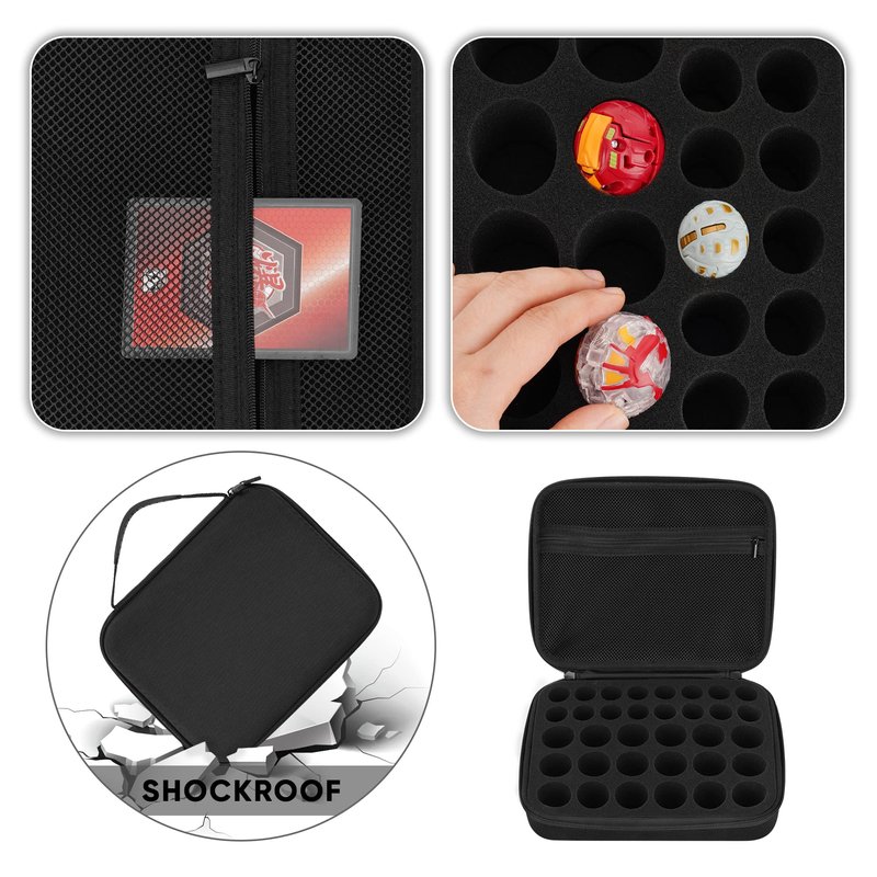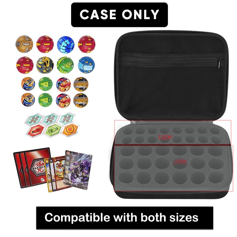 - Can Holds 34 Bakugan Toys. The sponge circular grooves are designed in 2 different sizes. 18 35mm wide round slots and 16 25mm wide round slots for different sizes of Bakugan Toys.