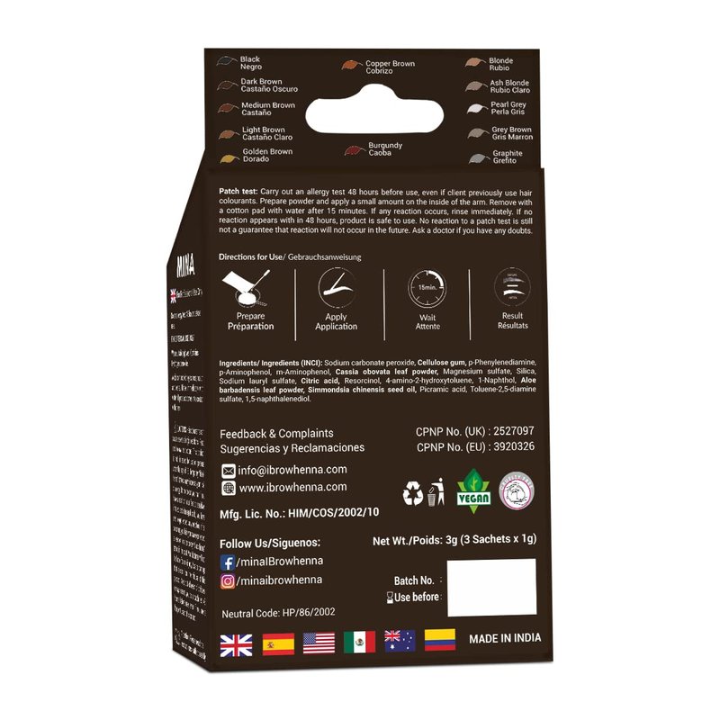 MinaiBrow hair color Regular pack will give your hair a beautiful and elegant coloration effect. This Ibrow hair Color kit contains 3 sachets of ibrow Cassia Obovata Leaf powder where one sachets can color up to 8-10 sets this means one box can color 25-30 sets. This will effectively covers resistant grey and also gives the spot coloring with coloring effects to the ibrow. The Minaibrow has no ammonia, no lead and free of all heavy metals. The kit contains: 3 sachets of ibrow hair color, Measuring cup, Spatula,Bottle to keep leftover, instruction leaflet, dropper.
