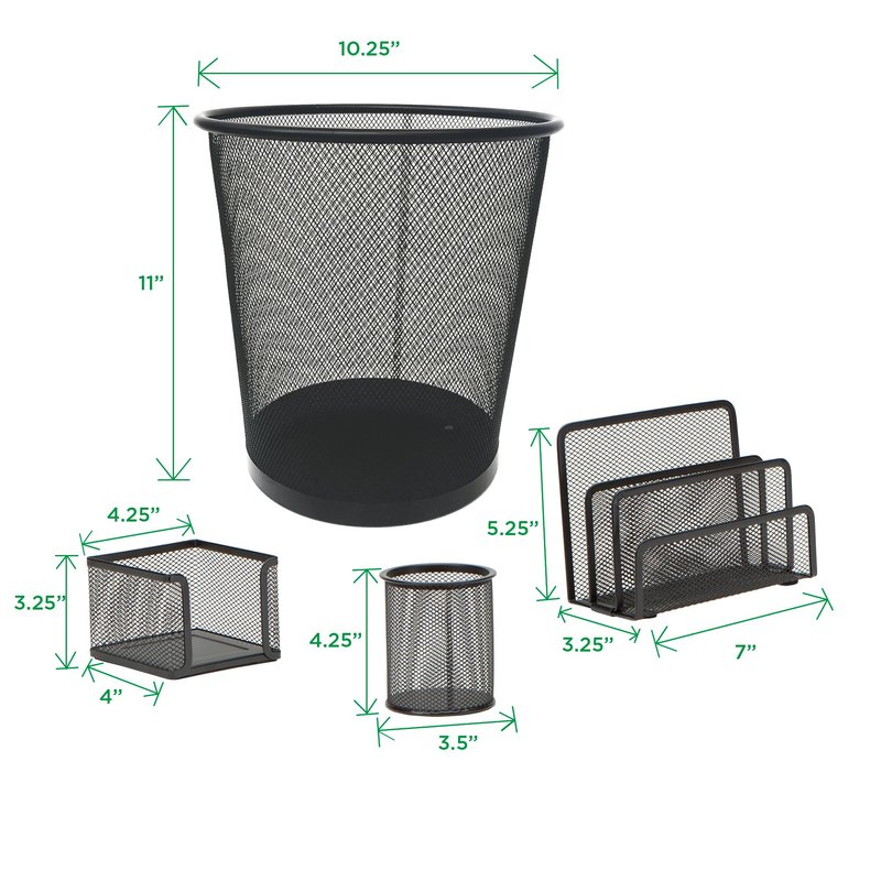 - 4 PIECE DESK ORGANIZER: Create a clean and simple workspace by using our 4-piece matching metal mesh desktop organizer set. Simple storage can be yours with our pencil or pen cup, paperclip holder, file folder or sticky note organizer, and trash can.