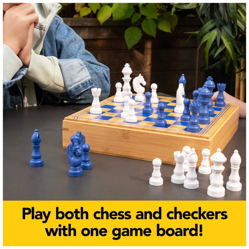 - Includes 1 Bamboo Gameboard Case, 32 Chess Pieces, 24 Checkers Pieces, Instructions