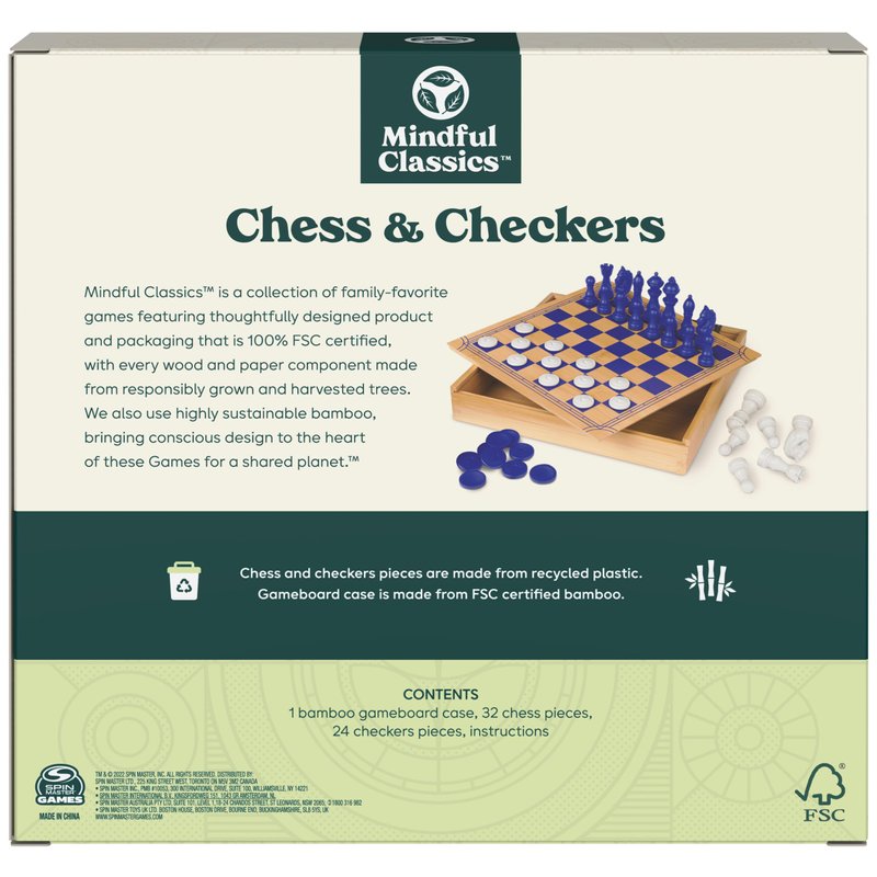 Mindful Classics, Chess Checkers Board Game Set with Bamboo Wooden Box Family Board Games Eco-Friendly Gift, for Adults and Kids Ages 8 and up