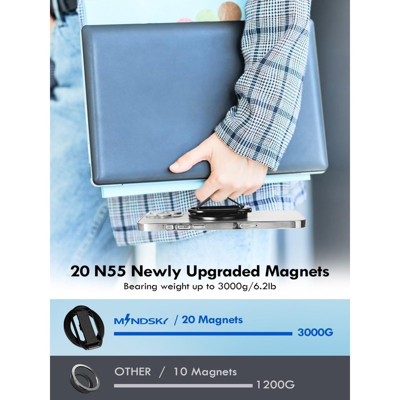 - 【Super Strong Magnetic】The Mindsky All-aluminum alloy ligament version phone ring holder use N55 magnets which can provide Super strong magnetism, Up to 2 kilograms of force , Allows you to use it with confidence without worrying about the ring falling off (We give away 1 magnetic ring)