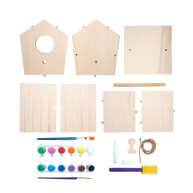 - Includes: 9 solid-wood pre-cut birdhouse pieces, 13 paints, craft glue, 1 flat-edge paint brush, 1 tapered paint brush, 1 sponge brush, jute twine, instructions, painting guide and bird guide; assembled birdhouse measures 7'' x 7.25'' x 5.5'' (Ages 5 and up)