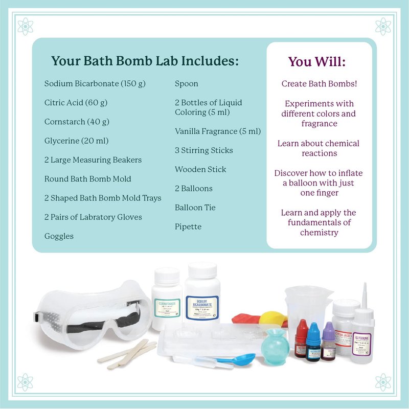 - WHATS INCLUDED: Sodium Bicarbonate, Citric Acid, Cornstarch, Glycerine, 2 Large Measuring Beakers, Round Bath Bomb Mold, 2 Shaped Bath Bomb Mold Trays, 2 Pairs of Laboratory Gloves, Goggles, Spoon, 2 bottles of Liquid Coloring, VanillaFragrance, Stirring Sticks, 2 Baloons, Balloon Tie, and Pipette