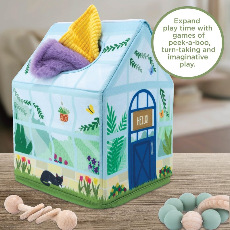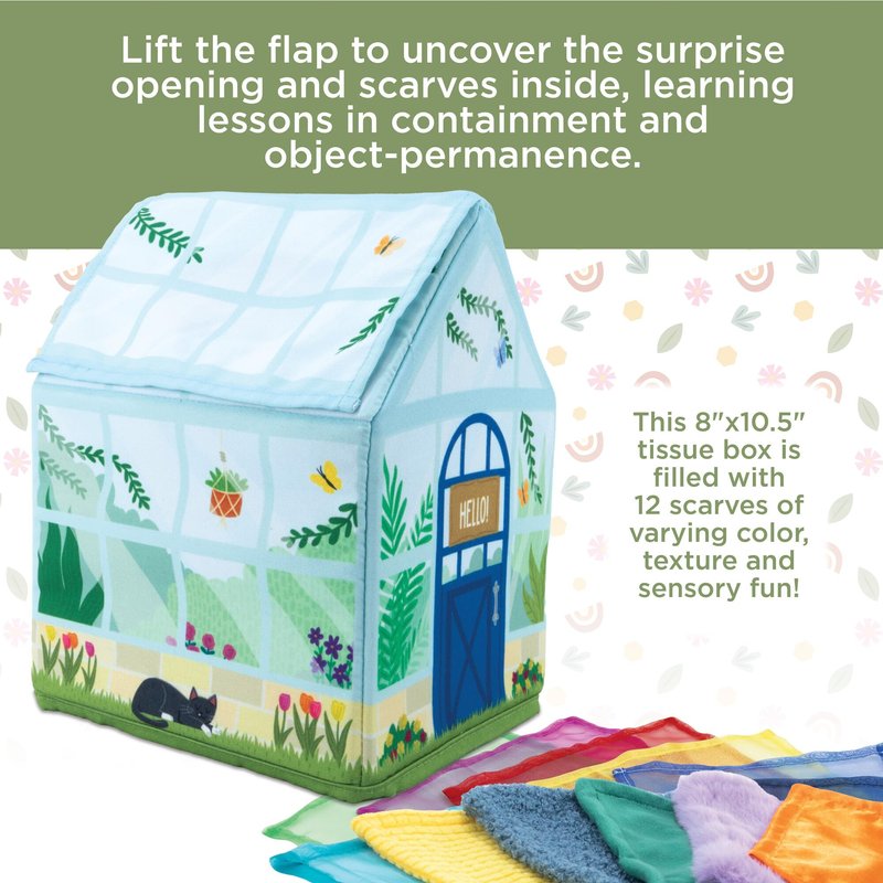 MindWare Sensory Sprouts Tissue Scarf Box - Montessori Toys for Babies 6-12 Months - Baby Tissue Box Toy - Soft Greenhouse-Shaped Tissue Box and 6 Sensory Scarves Featuring Different Textures