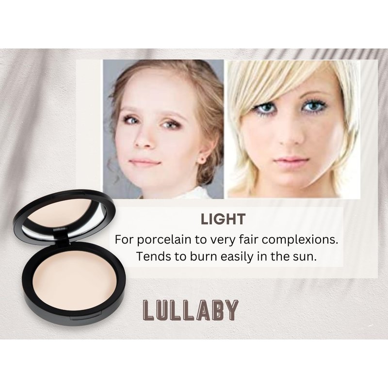 - LULLABY (Light) - For porcelain to very fair complexions. Tends to burn easily. This talc free powder makeup is the perfect compact face powder for oily skin. Please watch our videos on YouTube for more makeup tips! Search for "Mommy Makeup Concealer and Foundation Application Tips".