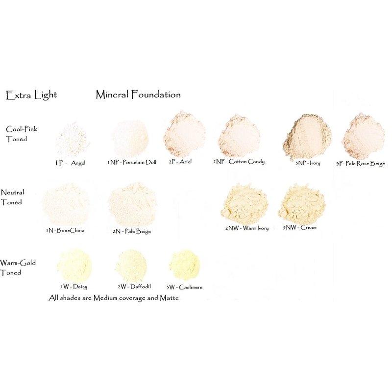 Our lightest shade range from palest porcelain to ivory. The shade level and tone is indicated by the number/Letters before the color name. Shades in this group range from 1 being nearly white to 3 - very light Ivory. Tones are N - Neutral NP - Neutral Pinkish P - Pinkish NW - Neutral Warm W - Warm OL - Olive (ashy ) IE: 1N = Palest shade - Neutral Tone 2NP = 2nd palest level with a Neutral Pink tone 3NW = Pale Ivory with a slightly warm tone. Natural mineral foundation gives the most natural makeup coverage possible. Perfect for young skin as well as mature. Helps cover imperfections without a cakey or heavy feel. Very lightweight and natural feeling. Zinc oxide is a natural sunscreen an is soothing for troubled skin. Perfect for Rosacea sufferers. Easy and quick to apply, just buff it on with a fluffy brush. Our foundation contains zinc oxide a natural healing mineral that is a natural sunscreen. Great foundation for rosacea and acne sufferers. The pale collection in order from palest to a light Ivory - with a neutral tone. Only for very white skin, may look chalky on other skin tones. If you are not sure of the shade you need please message us before purchasing - if you can include a photo we can help you select a color. We also offer a 5 shade trial set in small pots so you can try out different shades first.
