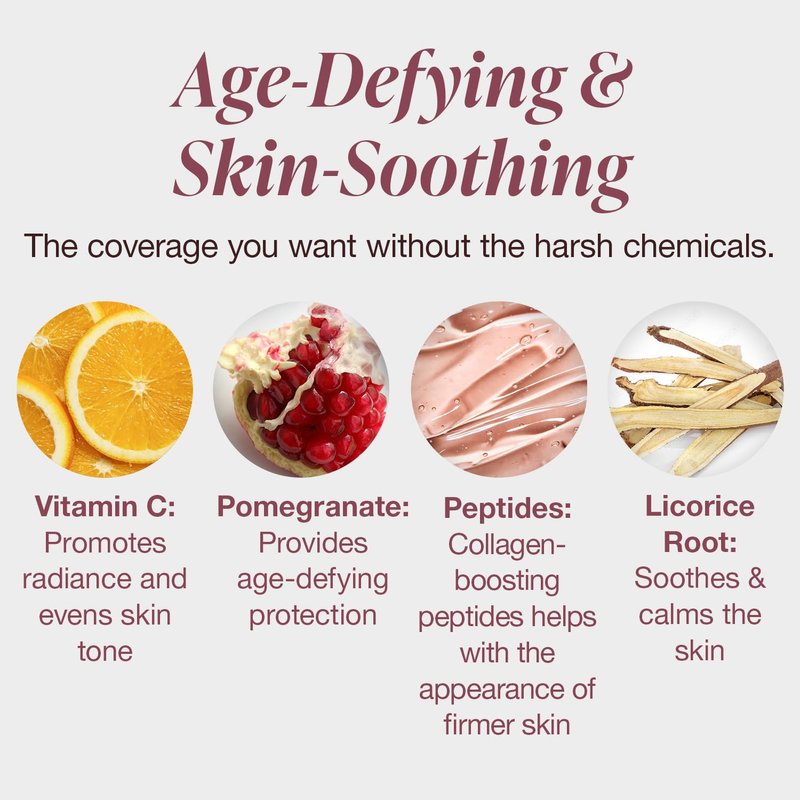 - AGE-DEFYING: This matte foundation is infused with a blend of antioxidant-rich Green Tea, Pomegranate, and Peptides that helps encourage firmer, youthful skin. 100% Vegan makeup enriched with Lavender, Aloe Vera and Licorice Root Extracts for a calming, soothing effect